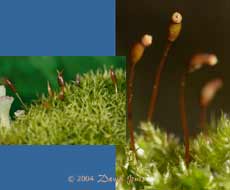 The right hand image shows fruiting capsules on another patch of moss. These have obviously matured and have lost their caps.
