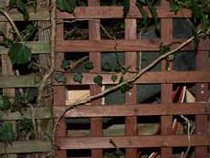 The picture shows it in place behind a lattice panel under the Ivy tree. You can see the cabling hanging down -this will be tucked away tomorrow, when I have completed my checks. While the video and audio leads are connected to the house, the 12v supply is routed from the Blue Tit box where I will be running it via a timer switch to turn it off during the hours of darkness.