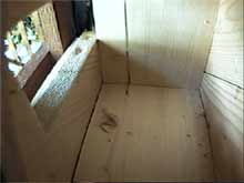 This picture shows what the camera sees at mid day, without the interior light on. I should have said that the entrance faces north, and you can see the dark wood of the lattice panel outside the entrance. With nesting not due until late March onwards, we shall have to be patient! |