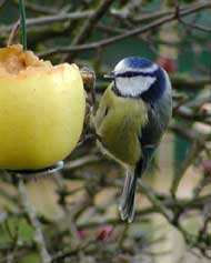 The Blue Tits continue to spend much time in the garden, feeding at the table and on the apples, as this one is, although I didn't see any 'faces at the door' of the birdbox today. Neither have I seen them visit the box next door over the last few days. The bird in the photograph spent quite a bit of time calling loudly from high in the Hawthorn just before going to the apple. This, and its bold eye-band suggests that it is a male.