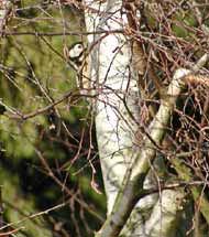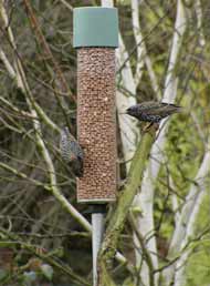 One thing I will probably take down is the feeder I've just put up! Here it is, as photographed from the house. As you can see, it has been discovered by the Starlings, but there is no sign yet of the Woodpecker. The top of it stands about 9ft up, and you can see the branch is being used as a perch. The Starlings didn't discover the food in the holes.