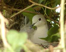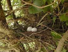 Walking down to the bottom of the garden has to be undertaken quietly now as the Collared Dove sits on her nest, although she is very tolerant as long as you don't move too quickly. I took advantage of one of her absences to take this photograph to show her nest with two white eggs (the camera was at the end of a monopod which was held up with the camera's self-timer operating).