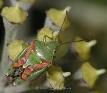 It isn't a species that I can recall seeing here before, and a search of both the guide books and the web was needed to ID it as a Juniper Shieldbug (Elasmostethus tristriatus). I finally found a printed image of the species in a copy of the BBC Wildlife magazine of June 2004 where it says that it is normally found on 'Limestone hills on Juniper and elsewhere in parks and gardens on Lawson's cypress'.
