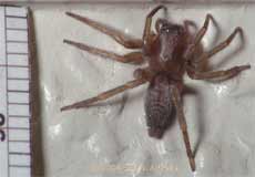 Finally, a hunting spider active on a rather dusty(!) bit of wall inside the house. It is a female, about 9mm long, with legs just a little bit longer. I have yet to ID it.