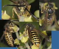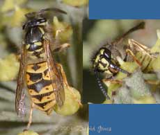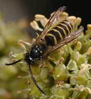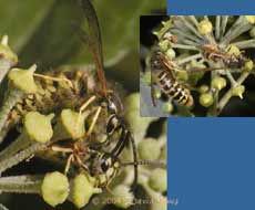This wasp stood out from the rest when it arrived on the Ivy, with its thin bands of yellow and just two yellow spots at the back of the thorax. Also, its antennae are all black and shiny whereas those of the first wasp are like this only at the bases. The nearest match I can find for this one is Dolichovespula adulterina which is a cuckoo species. I need to check on this ID.