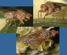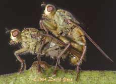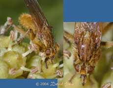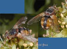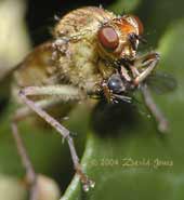 This individual appears to be much more hairy than the one I pictured eating a fly yesterday. When I look at the mating pair, the male also appears to have a thick coat of orange hairs than his mate, which makes me suspect that today's fly could be a male. Is the fly-eater a female? It had been suggested that the flies are actually dung-flies, although I still do not know the species. Click on images to see larger versions |