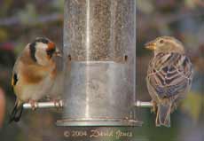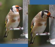While I was down at the far end of the garden I was entertained by the high frequency chirping of a flock of Long-tailed Tits as they repeatedly checked out the upper branches of the Birch tree. There was no chance of getting a picture of them, but once I was back indoors I did have better luck with this goldfinch at the thistle feeder.