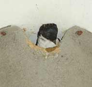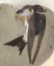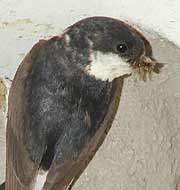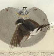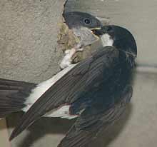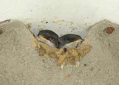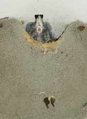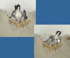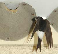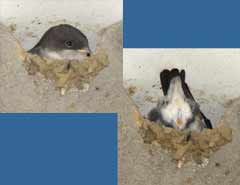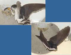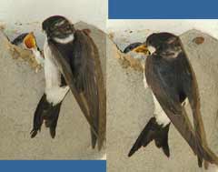 5 September - Another sunny day, with the temperature this afternoon just a fraction of a degree below 30C! I spent just a short period watching the House Martins today. Unlike on previous days, I was concerned that my presence today was causing the adults some stress. I was in exactly the same position as on previous days - the only difference is the colour of the shirt I wore! I wonder if it to do with the fact that the chicks are now appearing at the entrance, and as such are more exposed. I changed cameras, replacing the Olympus 2100UZ with the E-20 which allowed me to use a cable release from a more discrete position on the ground. These are two images taken 'remotely' with the E-20 - the right hand one shows how the chicks disappear immediately after feeding as the adult flies away.