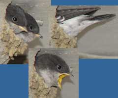 Perhaps the morning sunshine had encouraged the insects to fly - the parents were bringing food more frequently this morning. As usual, getting a picture of them arriving is quite a challenge. This image shows one having to abort its approach at the last moment as the entrance was blocked by the rear end of a chick! Click on images to see larger versions
