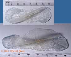 Having said that, the word creature doesn't really do it justice as it is a well organised floating colony of individual polyps, the ones around the edge acting as tentacle to capture food that is passed to a central polyp that digests it. There is a third type of polyp that act as reproductive organs for the colony. I collected a few of the floats, and these pictures were taken back at the caravan. I understand that Velella occurs in two variants, ones where the sail is oriented NE to SW along the long axis (left handed), and those where it's orientation is NW to SE (right handed). All the specimens I picked up were right handed. It seems that the sail's angle will normally cause Velella to travel at 45 degrees to the true wind direction so that right and left forms will travel in different directions. I also kept a look out for other species that sometimes accompany Velella but without success. 26 September - Much of today was spent relaxing at Lizard point (most southery point on the British mainland), watching the ships go by. I spent a short time down in the cove on the west side of the point and found just small numbers of Velella there. Again, their position on the shore suggested that they had not long been washed ashore. I couldn't see any in the water, although the sea was choppy. 27 September - Over the last couple of days the camera has had little use. There have been some butterflies about in the filed around the caravan, but I haven't been able to get close to them. I have yet to see any moths in the men's washroom (unusual!) but in the evening I did encounter a bat there, which left before I had a chance to see it properly. During our summer visit I found the floor littered with moth wings one morning. I can only guess that a bat had visited during the night, after the moths had been attracted into the building by the bright lights the previous evening.