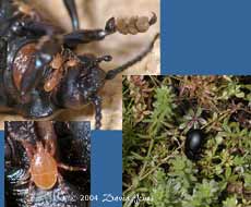 The left hand images show how one of the beetles was playing host to four very agile mites(?). The top image also shows the hairy pads that are present under each foot.