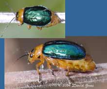 Afterwards I walked over to the spot where I saw the beetles yesterday. They were still there, on the bedstraw plants ( don't know the species), and this time another beetle on the same plant caught my eye. This little one was about 1cm long with an metallic green elytra that looks far too small for it.