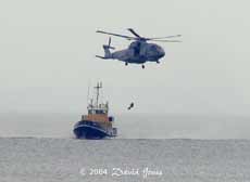Out at sea, in Falmouth Bay, this helicopter training went on for much of the afternoon. The Merlin helicopter followed the training vessel (Meon) as it travelled up-wind, depositing a crewman onto its rear end, and then lifting him off again. At least once he landed flat on his back!