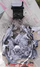 The picture shows the offending object, mostly melted and covered with powder from the extinguisher. It had been hanging from the bracket, but had melted and fallen down from it. There was a small amount of cosmetic damage done to the cupboard the fan had been hanging from, and the carpet it fell onto - a repair job that will keep me occupied on a cold winter's day.
