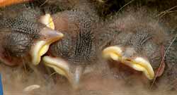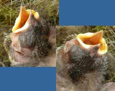 This second picture was taken directly from behind the glass as a couple of the chicks stretched up to beg for food. You can see the developing feathers under the mouth, and their eyes open.