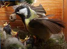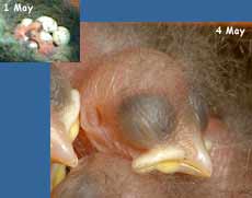 14 May - We are coming to the end of the second week of development for the chicks. The reference books say that fledging takes place at between 16 and 22 days, which means that sometime next week the chicks will be taking their first flights. Today they have certainly gone a long way to reaching that day and have been very active. Lat night they were much more restless, and mum spent very little time actually on the chicks. While some of the time she tried to keep them covered, sometimes with wing spread, at other times she was in the nest cup by their side or perched at the side of the box.