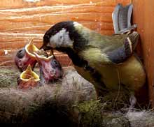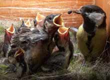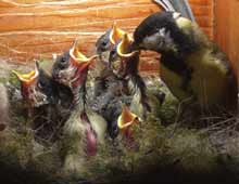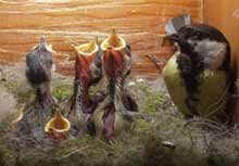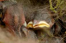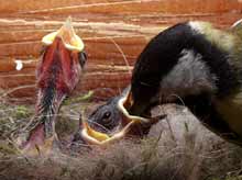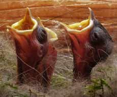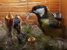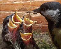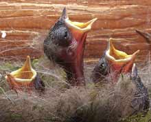 Three of the chicks vie for a chance to have a caterpillar pushed into their throat.
