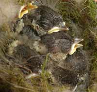 The amount of feather coverage means that the chicks are now starting to look like birds, if rather scruffy. Also, they are starting to climb up over the side of the nest cup, as this one has done.