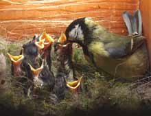 Of course, after many of the feeds, the parent waits to see if one of the chicks produces a faecal sac. This picture of the mum just about to collect one gives us a chance to see the underside of a chick - It this moment the chick is virtually upside-down. There is great deal of bare skin between the tracts of feathers. The top image shows the same moment from a different angle - captured via the mirror.