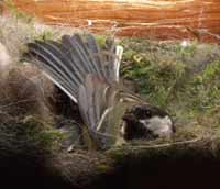 A short time later the nest became a different place when another bird peeped in through the entrance. Notice how the chicks managed to disappear into the nest cup as mum went into a defensive posture over them. After an explosive flicking open of her wings she got into this position and stayed still and quiet for a minute or so while something moved about on the roof.