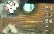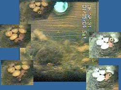 However, at 6.29am she had her head down in the nest cup for some time and its constant movement (not the usual egg turning) suggested something was happening. Then, when she left the box at 6.32am we caught our first sight of a single chick, although you have to look carefully at the object on the egg in the centre. The 'object' moves between images.