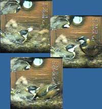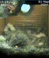 As well as bringing food, the parents have to deal with the chicks waste. These two images show a mum is collecting a faecal sac, which she then ate before leaving the box. You will need to look carefully at the mirror image in the large version of the picture.