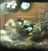 At 7.40am I could see a limb waving out of the end of a third shell, but it wasn't possible to get an usable image of the three chicks until a bit later. Both parents were active from 7.18am when the male brought an outsized grub just after the female had given one of chicks a small green larva. This webcam image shows the female holding another large offering as her partner is about to inspect the chicks.