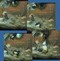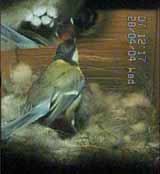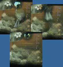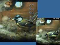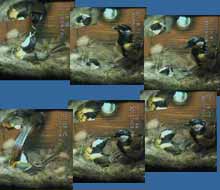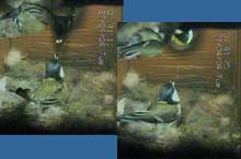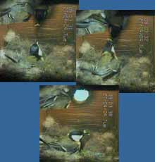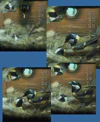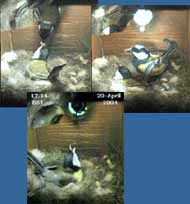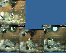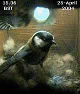 I saw her being fed on two occasions during the day. The top two images, recorded at 8.40am show the first feed. The male came to the entrance but although the female responded in the way I described yesterday, he seemed reluctant to hand over the food. He withdrew his head four times before the food was finally passed to his partner. It was only afterwards that he entered the nest, just stopping for a moment before leaving again. He did not enter the box during the lunchtime feed, shown in the webcam image. In the above images the video time/date display is missing as a result of a silly mistake by me this morning. I intended to replace the low voltage unit that powers the device, but mistakenly plugged in another one that had its connections reversed - the device died. Fortunately it's back in action now. I managed to pinpoint the component that had failed and found a replacement in my shed! I haven't been keeping any record of her comings and goings today, but I'm pretty sure that she has been in the box even more than yesterday, and she settled in for the night much earlier.