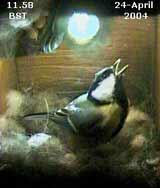 Each time it was an insect or a larva that was brought, several were large brownish coloured caterpillars (I think), like the one in this webcam image. The female left the box immediately after this feed. On another occasion the larva was so big she seemed to have difficulty swallowing it. I didn't see him at the bird table today.