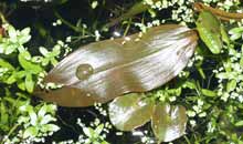 20 April - The tadpoles continue to grow and the newts continue to feed! The most obvious changes to be seen in the pond at the moment concern the plants. Plants are shooting up all over the place. On the water surface the reddish green, oval leaves of the Pondweed (Potamogeton sp.) have started unfurling (In the top right corner you can see a leaf that has yet to do so). The rounded leaves at the bottom of the picture are of a Fringed Water-Lily plant (Nymphoides peltata).