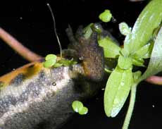 Newts continued to feed on them through the day. This one had just eaten one when I took its picture. It appears that most if not all the adult newts I see in the area are males, judging by their frills. The females can be seen amongst the floating plants in the deeper part of the pond.