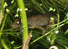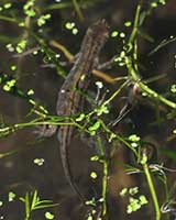 I saw a three newts tonight - this one remained stationary all the time I was by the pond. It is 'perch among fronds of Hornwort (Ceratophyllum demersum). If you look closely you can see a small, light grey flatworm just about to pass over the newt's head. Click on the images to see larger versions