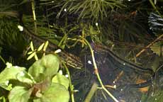This image shows a moment when newts were gathered together in the open. A close look will reveal that there are not just five adult newts, but also a newtlet (rather orange in colour, centre-left), one of last year's brood, that seems to have joined the feeding party.