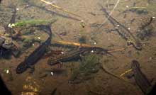 I did not see any in the process of egg-laying so far today, but I will be going out to take another look later. In the meantime, this picture shows an encounter between two males. The newt on the right was the most animated, bending his tail as you can see, and vibrating it furiously before moving on.