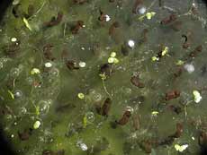 This image shows one emerging from an algae covered frogspawn mass. You can see the recently emerged tadpoles clinging to the mass.