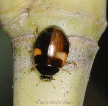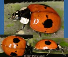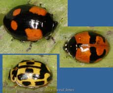 The top two images show a couple of the 2-spot variants here today. The one on the left has been photographed before but the right hand one is a new arrival - it is known as a 'band and loop' variant of Adalia bipunctata. The lower image is of a 'spots joined' variant of a 14-spot Ladybird (Propylea 14-punctata).