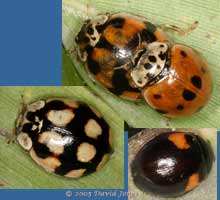 This is a group of 10-spot Ladybirds (Adalia 10-puntata) seen today. The lower-left image shows a chequered variant. the bottom right is (I think) a melanic variant. The mating pair includes a strongly marked female that I haven't seen before today.