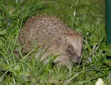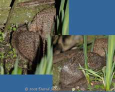 Going outside to take my usual wander down the garden before going to bed, I was greeted by the snorting of a couple of hedgehogs. They were in amongst the Irises and Red Campions behind the ponds so I couldn't get a good view. You can see from the photographs that one of them has some areas of white in it, which should make it easy to identify in the future. While these two were busy prodding each other with their snouts, a third hedgehog was happily munching away at the pile of chopped peanuts I had put out for them. This is the first occasion for a few years when I have seen three hedgehogs here at the same time.