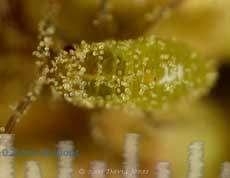 I managed just this one picture of it that gives some idea as to the scale of the Birch's pollen grains, the aphid being just over 1mm in length. On the basis of this image, I estimate that a pollen grain from the birch has a diameter of just over 0.03mm.