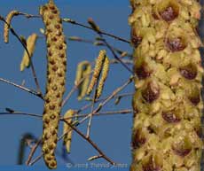 The catkin shown in close-up is about 6cm long. It may be incomplete - I found it on the ground, probably detached by a bird searching for food. Also, it's now possible to see green tips to the buds on the tree,