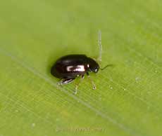 This much smaller beetle made an appearance on the bamboo in the late afternoon. Measuring about 1.5mm in length, it had enlarged tops (femora) to its hind legs, indicating that it is a flea beetle, although I don't know which species.