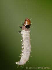 This much smaller caterpillar caught our attention as Sheila and I had coffee down the west Wing. Just under 1cm in length, it was dangling from a plant by a long silk thread and was swinging about in
