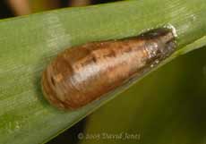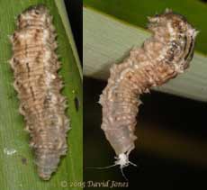 The one on the right is hanging but its tail end as it deals with the the remains of an aphid it has eaten. I first saw, and photographed this back on 18 June 2003 when I found them on grass next to the big pond. I'm wondering if these are related to the pupa I photographed back on the 23rd.