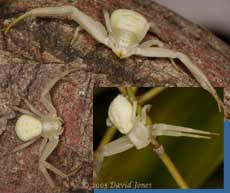 This spider was spotted in the late morning as it moved along the stems. It looks as though it could be Misumena vatia which is usually found on yellow or white flowers where it can ambush visiting insects. The lower right image shows it adopting a defensive posture when I moved in too close.