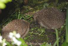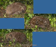 I was watching another one when this one entered the garden from our driveway and charged straight at the second hedgehog. It rammed into its side and pushed it across the ground for several feet, before dashing off into the undergrowth. The victim was left rolled up in a ball and stayed this way for several minutes. These attacks were repeated another five times over the next thirty minutes, and between attacks it dashed about, all over the garden. This sequence shows one of the last encounters. The top image shows the pair coming to a stop at the end of one assault. The second image shows the victim on its side (you may just make out its dark nose towards the left of the mass of spines. The lower image was taken just over a minute later as the hedgehog started to get back onto its feet.
