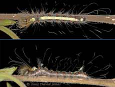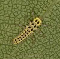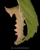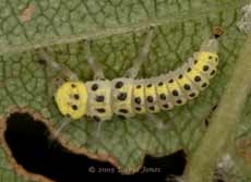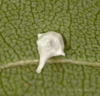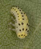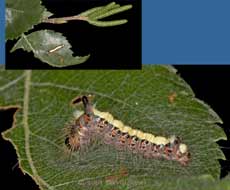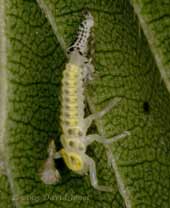 As each larva develops, every so often it needs to moult. This image shows a larva that has done just that, leaving its cast-off skin joined to the leaf.