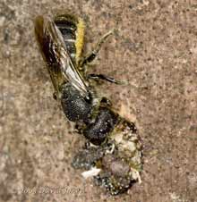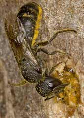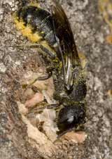This second bee was still working on completing the basic sealing of its nest hole. It is quite difficult to get a decent image as the bee is almost continuously rotating around the hole as it works on the seal.