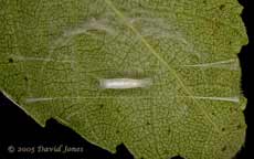 I should have stayed around to watch but I'm afraid I needed to get to bed so I only took a few photographs, some of which you can see if you click on the image. A week ago I spotted this cocoon (or refuge?) under a leaf on the Birch tree, but have only just go around to looking at the images. The cocoon, measuring just over 4mm in length, is supported within quite a complex structure of threads. First of all, two multi-strand threads hold the sides of the leaf under tension so that it takes a concave shape. From one of these threads the cocoon is securely suspended above the leaf surface. There is also a crescent shaped protective(?) barrier on one side of the structure.
