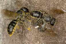 23 August - After a thoroughly wet yesterday, this morning we awoke to blue skies again. First thing yesterday morning I took advantage of a pause in the rain to go down the garden to check on the caterpillars. While the Grey Dagger was (and still is this morning) continuing to munch its way through leaves, the Iron Prominent had left its grazing patch. A quick search was needed before I found it some way along the branch, heading in the direction of the trunk. It was now much darker in colour, nearly all brown. I dashed back to the house to get my camera but by the time I got back it had disappeared!!! I know that caterpillars can move quite quickly so I searched for a few minutes without any luck. Knowing that this species pupates underground I dropped a small piece of wood from where I last saw the caterpillar and searched the ground around its point of impact without luck. Then the rain returned. This morning, another check revealed nothing. I had an interesting e-mail yesterday concerning the solitary bees that I photographed on 15 August. They may be a 'Red Data Book' species, Heriades truncorum (Daisy Carpenter Bee), which would mean that they rare in the UK - I await confirmation or otherwise on that before I get too excited.