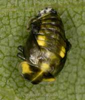 On another leaf is this fully formed pupa. At the top you can just make out the larva skin cast off as the pupa formed.
